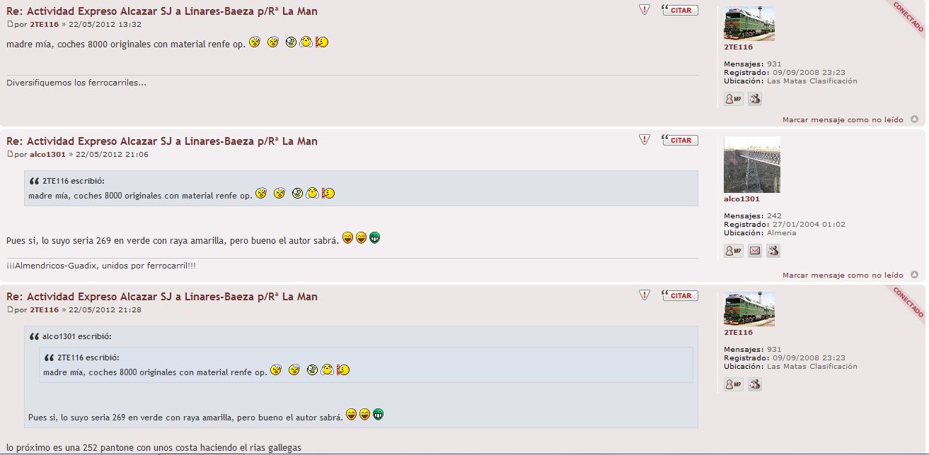 así que no veo el porqué de sus críticas hacia trenloko, cuando usted ya no es ni usuario de msts, al contrario que el resto de personas que hemos comentado en el hilo, y que no tenemos nada que objetar sobre el consist de la actividad de Trenloko, por lo que si a alguien no le gusta la actividad, que cambie la locomotora, o directamente no realice la actividad, y como la actividad es de Trenloko, el material lo elije él.
