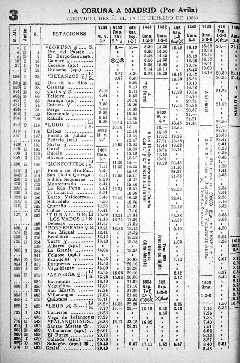 Un ejemplo al azar. Horario Madrid - La Coruña de 1953 que ilustra bien lo escrito.