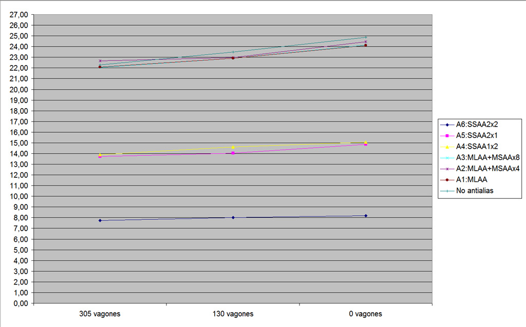 Test 1: 18 horas. La influencia de la malla en el escenario es mínima, mientras los diferentes niveles de antialiasing determinan los FPS.