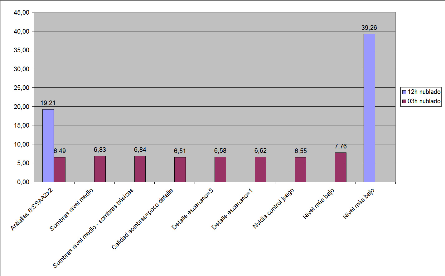 El cálculo con luces de noche es muy diferente al de luces de día. De noche, lo que va a determinar la caída de FPS no es la malla, sino fundamentalmente el nivel de antialiasing.
