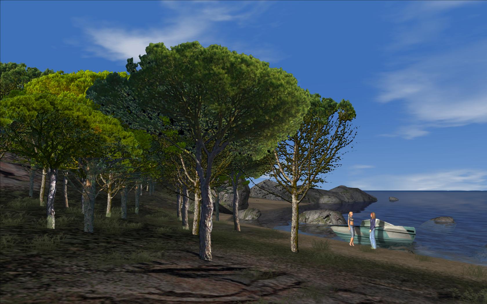 Siguiendo el manual "9.05 Create a Forward Facing Tree" , he estado trasteando con los shaders "TrainViewFacingFlora" e "invisible" y he podido ver que mapeando el cubo al que originariamente se le había aplicado la textura "invisible" con este otro shader "TrainViewFacingFlora", el simulador toma cada cara del cubo como si fuera individual, o sea que aplica el efecto ViewFacing a todas las caras una por una. Esto me ha animado efectuar un "detach" de las caras del cubo para así poderlas poner a diferentes niveles, simulando la pendiente de una ladera, realizando a la vez una única hoja de texturas de 1024 x 1024 con cuatro modelos diferentes de árboles y los he distribuido por las cuatro caras del cubo (cuatro porque he eliminado previamente las caras superior e inferior). El resultado es más que aceptable pero tiene una pega, para mi importante; no produce sombras! La ventaja que puedo encontrar, es que se pueden realizar grandes zonas de arbolado con un consumo mínimo de polígonos, ya que cada árbol sólo gasta uno, amén de la posibilidad de adaptarlos a zonas específicas del trazado en el que se requieran grupos de árboles variados y en pendiente. La falta de sombra dinámica sobre el objeto le resta entidad así que si alguien conoce más a fondo la posibilidad de éstos shaders, que no dude en aclarar el porqué de este comportamiento y si se pudiera mejorar cualquier aspecto.