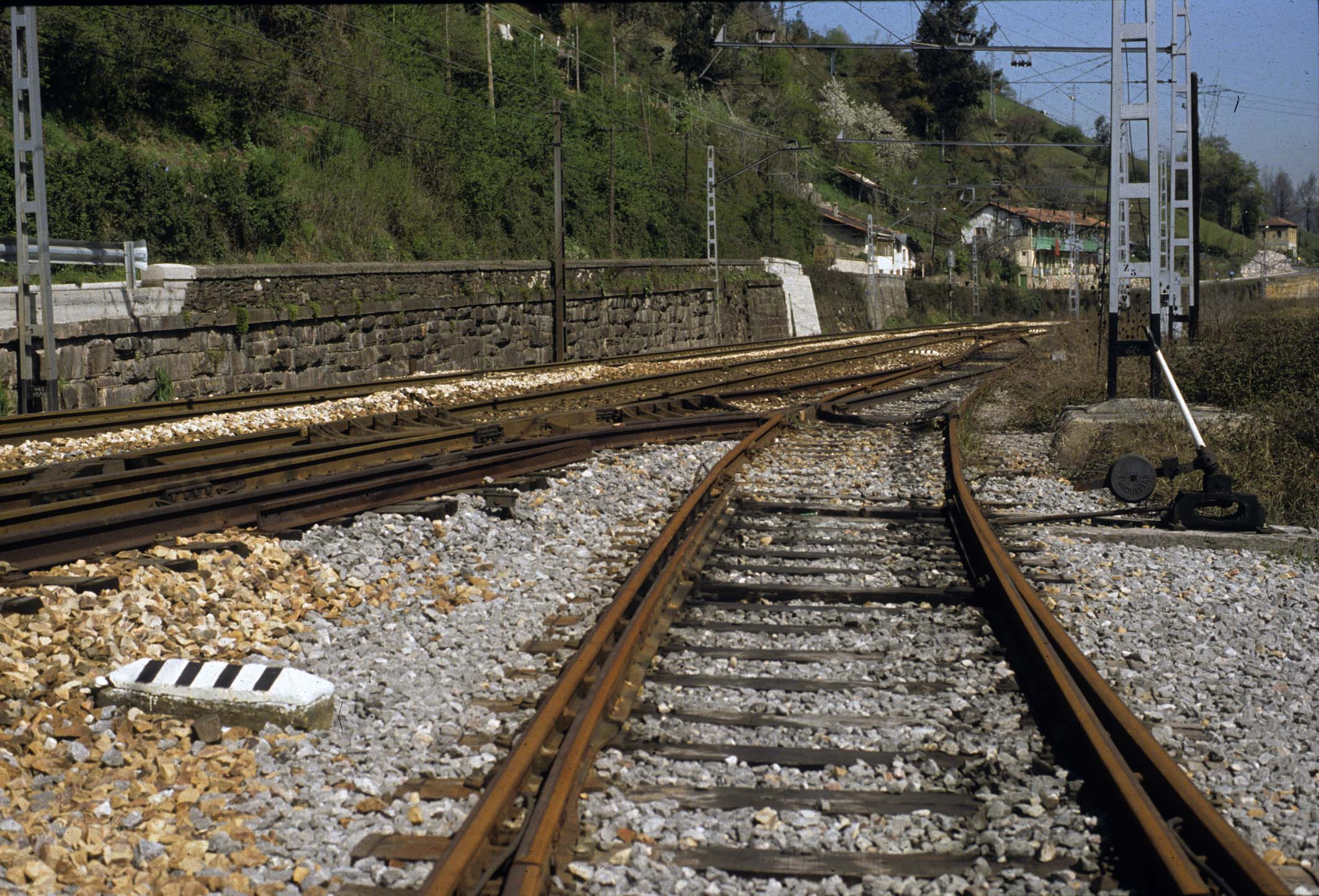 La entrada del apartadero en 1992. Tenía en esa época aguja de entrada y salida al mango, que estaba electrificado.