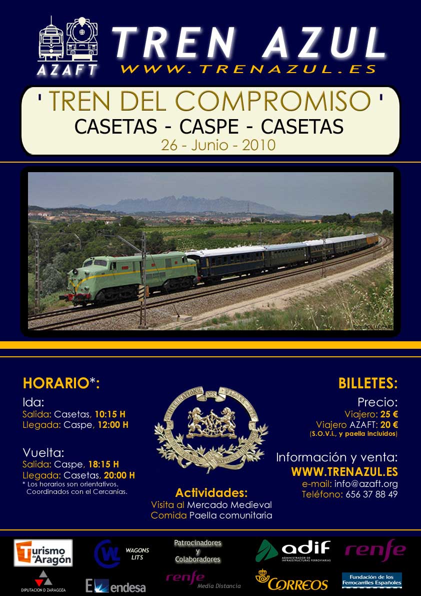 Una vez más la Azaft (Asociación Zaragozana de Amigos del Ferrocarril y Tranvías) sale de nuevo a la vía con su TREN AZUL. En esta edición denominada Tren del Compromiso el destino elegido es la localidad aragonesa de Caspe.