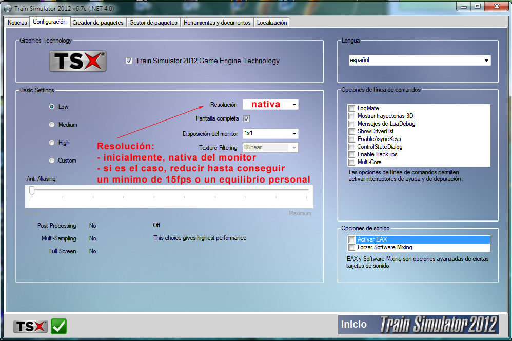 Mi equipo es un dual core 2,13 con una tarjeta Geforce 9800 GT. Todo el simulador a tope salvo en eso que señalo.