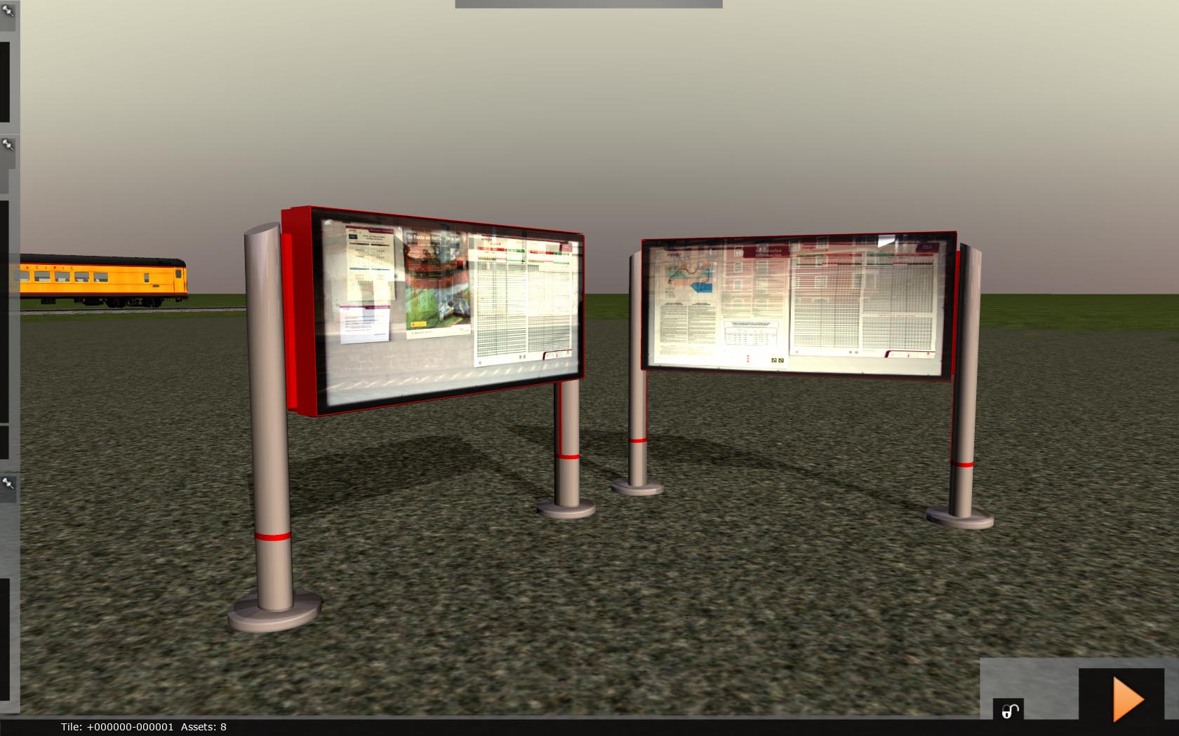 Aquí traigo un par de objetos mas que he hecho. Una farola de estación y un par de paneles de información, están hechos de tal forma que cambiando una textura se pueda cambiar el contenido del panel y así actualizarlo o poner lo que se quiera.