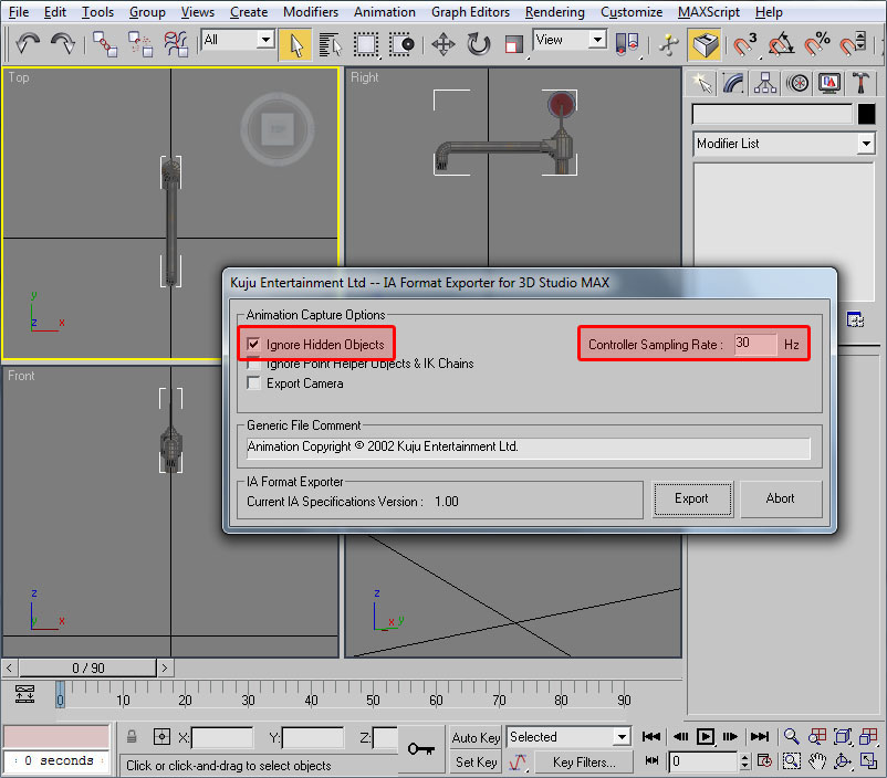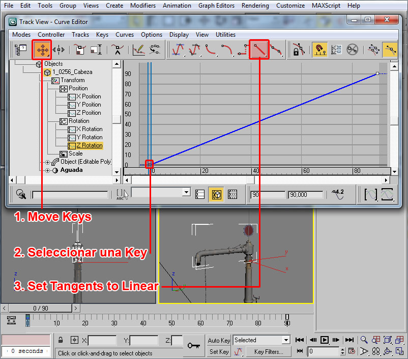 Donde he señalado en rojo el procedural, el cual recuerdo que debe tener todos sus puntos con la coordenada Y=0 (coordenada en 3ds), el pivote centrado en la escena y la extrusión de dicho procedural orientada en la dirección Y del pivot del objeto (con la longitud que deseemos para las texturas).