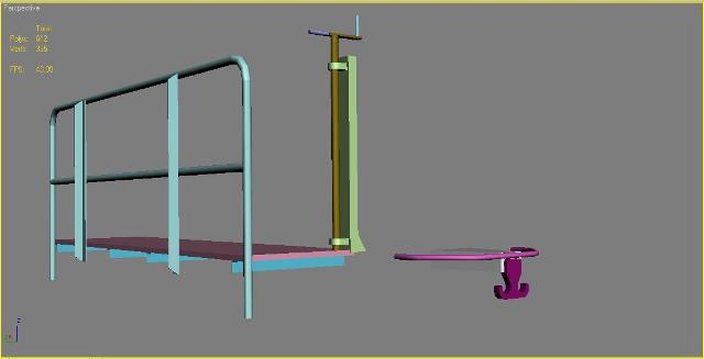 Buenas, me he estado peleándo con los topes, todavía sin terminar, pues trabajo están dando. La cosa se complica un poco porque aquí no es tan fácil como crear el contorno y extruir, sino que hay que editar el polígono resultante, pero vamos aprendiendo. He utilizado el comando Loft, mediante el cual se dibujan dos contornos y ha continuación se extruyen. También he utilizado Edit poly para acomodar ciertos vértices. El resultado no me convence mucho, pero es la primera pieza un poco compleja que hago.
