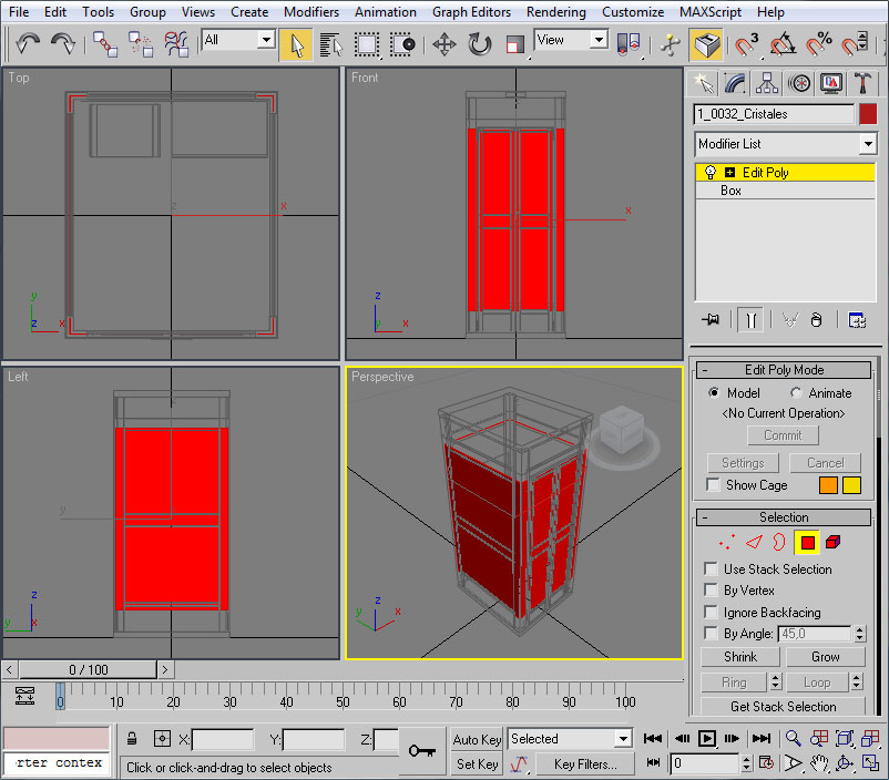Para representar los cristales de la cabina de teléfonos, primero los deberemos modelar mediante sus respectivos polígonos. En la siguiente imagen os muestro los cuatro polígonos que conformarán los cristales en las cuatro fachadas laterales de la cabina: