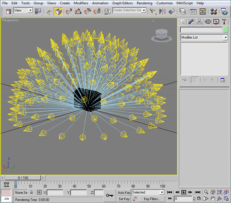Un cono invertido de 0,125 m de altura y 0,1 m de diámetro mayor. Está texturado con el archivo "Gizmo_noaplha.ace", que se halla en el subdirectorio Textures, y que le da esos colores amarillo y rojo. Esta especie de trompeta no es en realidad importante para el resultado final, puesto que no se visualizará en el simulador, es únicamente la manera para que el Asset Editor nos permita "ver" el punto de salida del efecto de humo, para poder ubicar, de esta forma, el efecto sobre el modelo. Podríamos modelar cualquier otra forma y colores, pero no variarán el resultado en el simulador, por tanto nos quedaremos con ésta, que es el "shape" por defecto que usan las creaciones de Kuju.