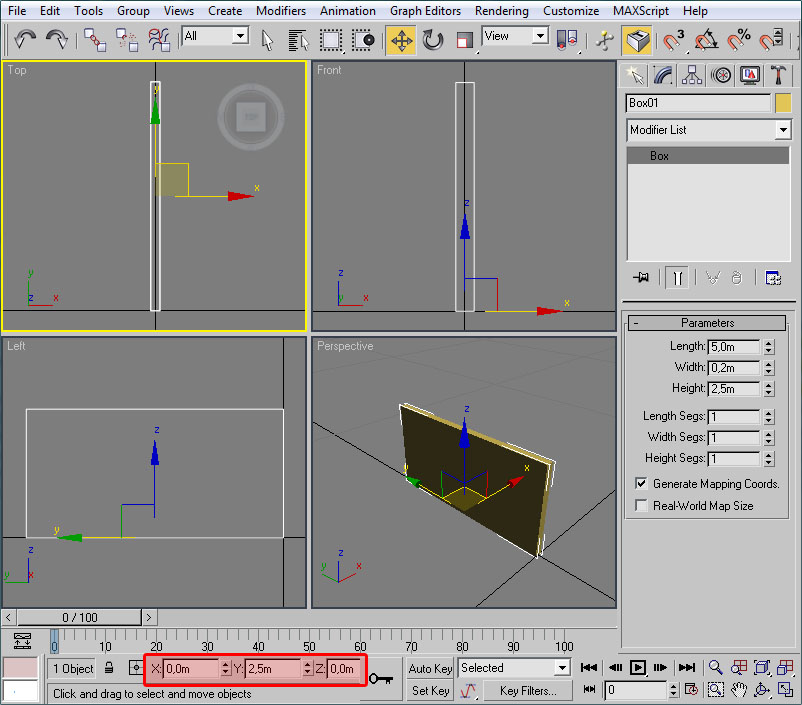 - En este eje debemos desplazarlo la mitad de su longitud, para conseguir de esta forma que el extremo posterior del objeto se sitúe exactamente en el plano definido por la coordenada Y=0. Las aristas de nuestro objeto que coincidan con este plano serán las que definan el elemento procedural (las que os mostré en rojo en el ejemplo de la carretera).