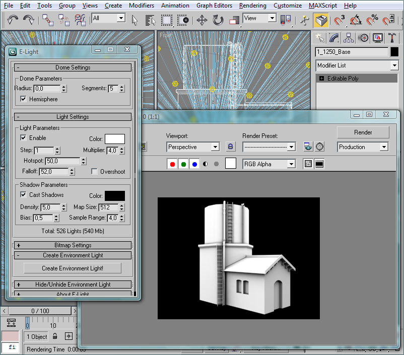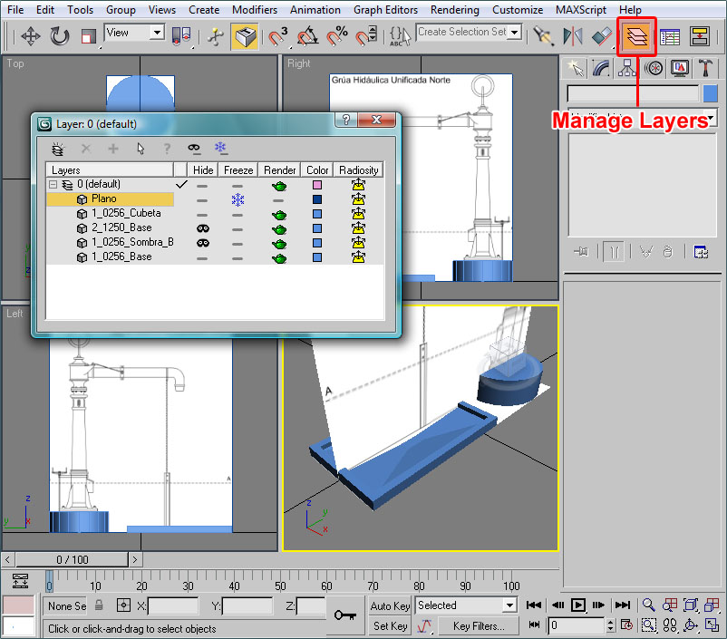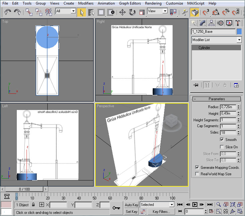 Donde he señalado en rojo el procedural, el cual recuerdo que debe tener todos sus puntos con la coordenada Y=0 (coordenada en 3ds), el pivote centrado en la escena y la extrusión de dicho procedural orientada en la dirección Y del pivot del objeto (con la longitud que deseemos para las texturas).