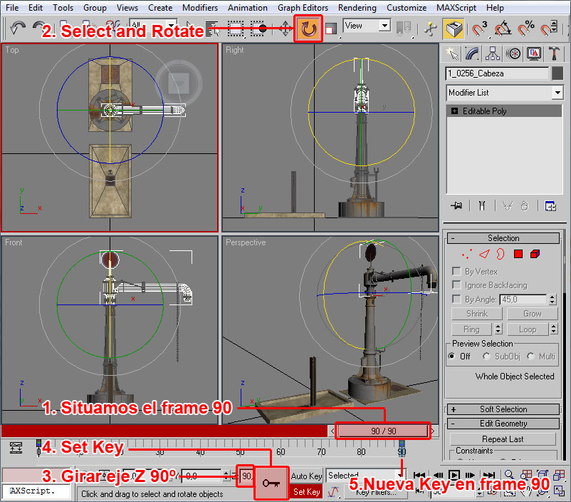 Importante:El conjunto lo deberemos rotar 90º, pues los objetos procedurales toman la repetición de la textura, a lo largo del elemento generado, en el eje Y de la misma (norte-sur).