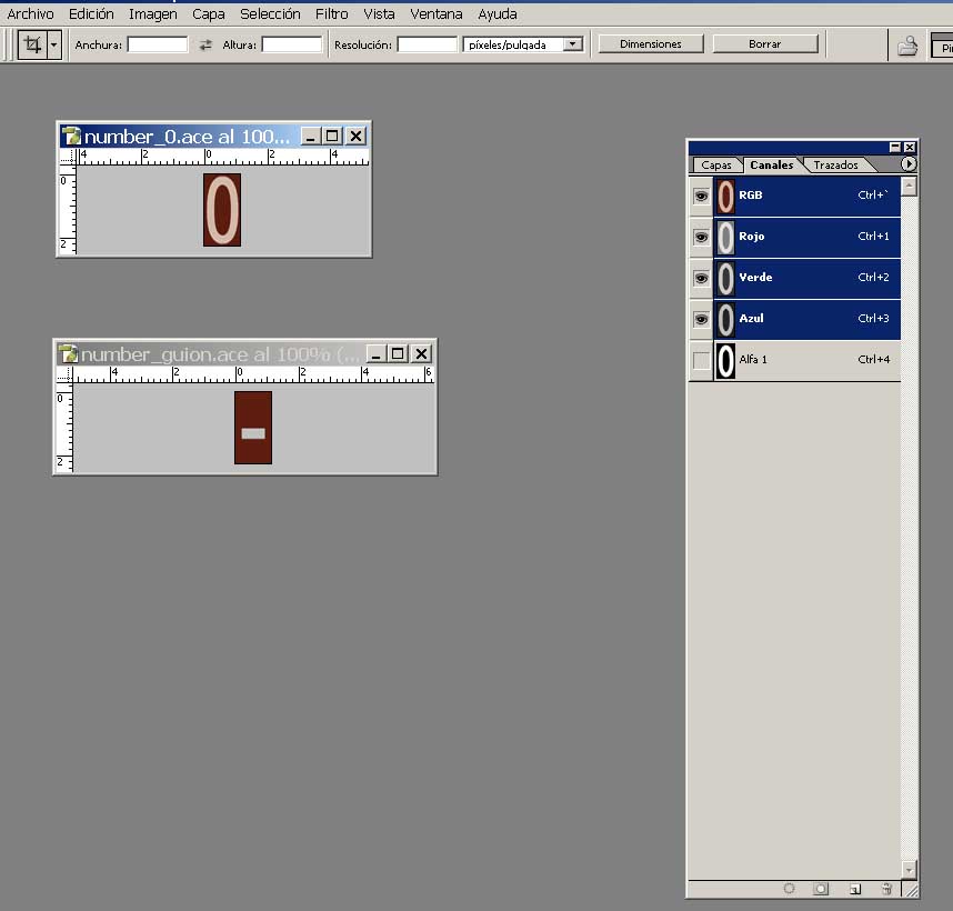 - Creo las texturas ace correspondientes a los número, letras, simbolos que quiera poner y las pongo en la carpeta Textures del modelo. En este caso, los números del 0 al 9 y el guión medio -. Tienen tamaño de 32x64 con un alpha como se ve en la captura. El tamaño, coloR y forma, puede ser cualquiera en principio. Los nombro number_0.ace a number_9.ace y number_guion.ace, pero el nombre puede ser cualquiera. A estas hojas hará llamada el blueprint específico de la numeración.
