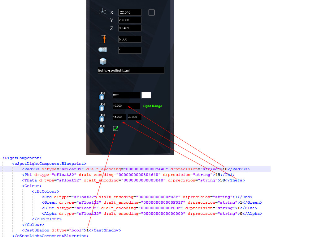Intensidad de la luz (potencia lumínica) = Ligh Range (en el editor de escenario) = Radius (en el fichero spotlight.bin en el script xml).