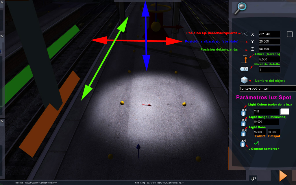 Vamos a conocer mejor los parámetros de ajuste de Altura (terreno) y Light range (intensidad) de las luces Spot: