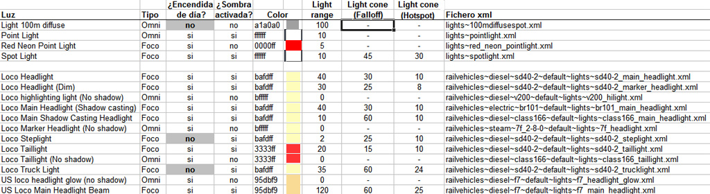 En la actualización del core de RW3 (v10.9 en febrero de 2012, válido para la versión actual, la v11.0b), la tabla de luces es la siguiente (clic para agrandar):