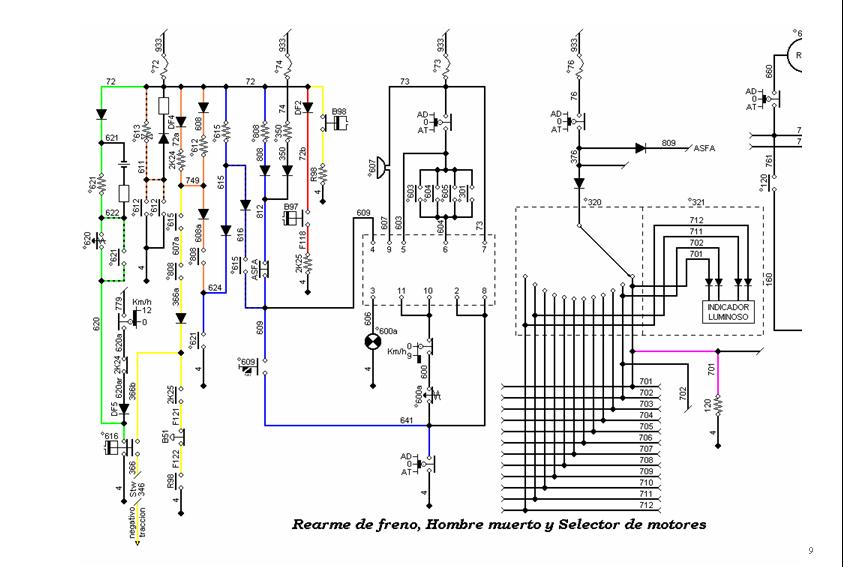 − Secuencia de pedal pisado: • A los 30 s de haber pisado el pedal se enciende una luz azul de aviso en el pupitre. • Si no se hace nada 2,5 s después suena un aviso acústico. • Si no se hace nada 2,5 s después se abre el lazo de freno provocando el frenado de emergencia.