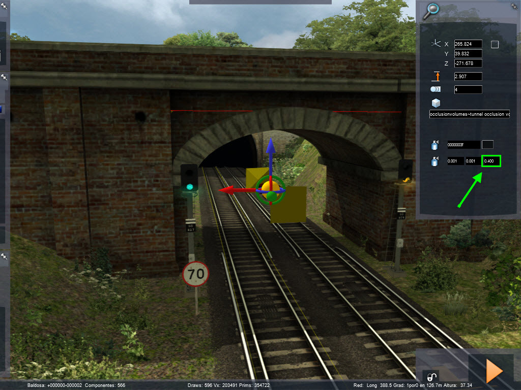 Y el valor a modificar es el que te muestro en la siguiente captura. El que sale por defecto es 400, y habría que poner un valor mucho menor, es decir, a mayor longitud del túnel, menor debe ser ese valor. Pero ahora está la pega de que el volumen que trae por defecto el simulador también tiene la limitación de que el valor mínimo es de 100, insuficiente todavía para túneles muy largos (como el de tu ruta) pero no es obstáculo si se crea un volumen propio, pues ese valor mínimo también se puede modificar.